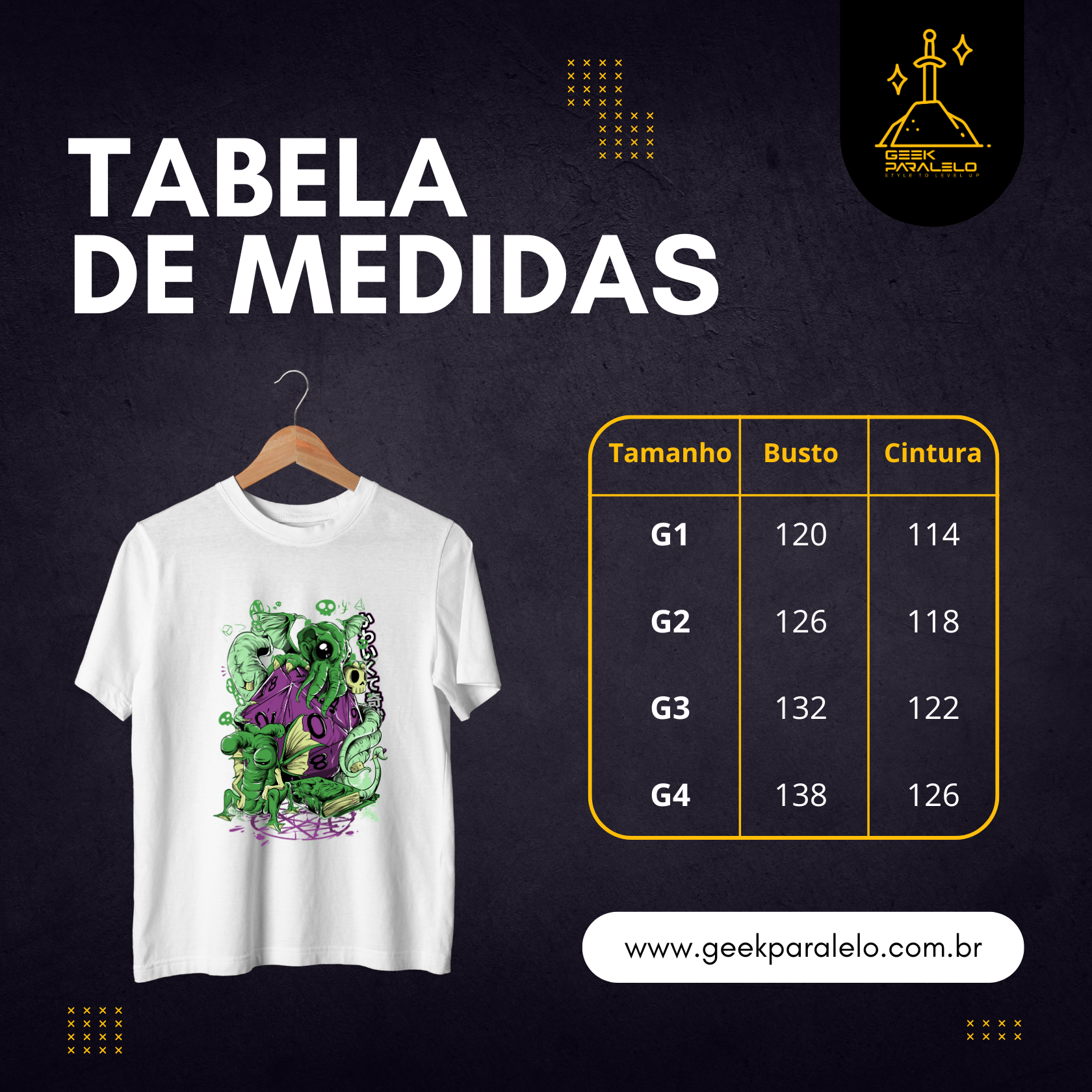 Cores do produto: Como cada tela de computador ou celular tem seu próprio jeito de mostrar cores, então a cor da sua camiseta e da estampa pode ser um pouco diferente do que você viu online.