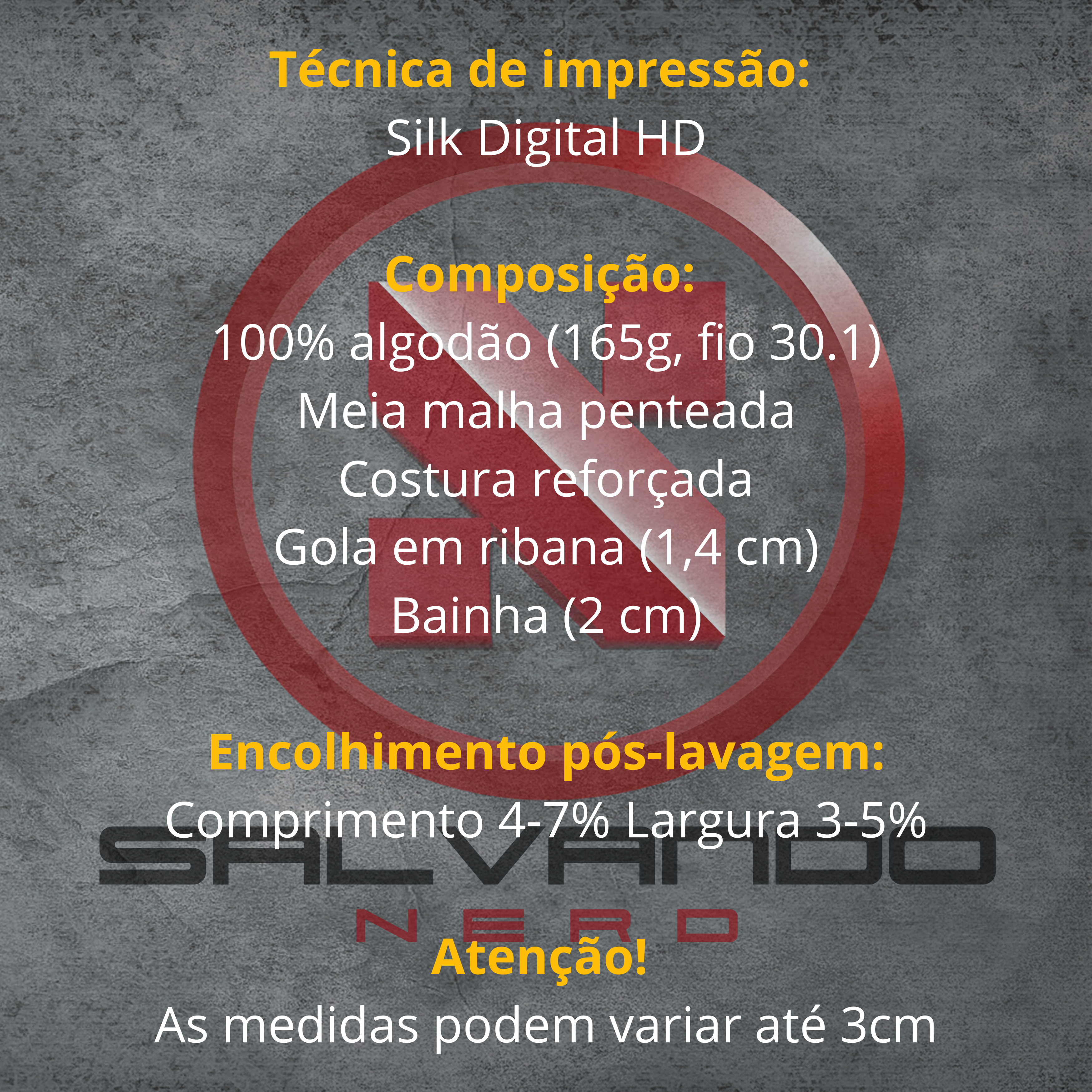 Cores do produto: Como cada tela de computador ou celular tem seu próprio jeito de mostrar cores, então a cor da sua camiseta e da estampa pode ser um pouco diferente do que você viu online.