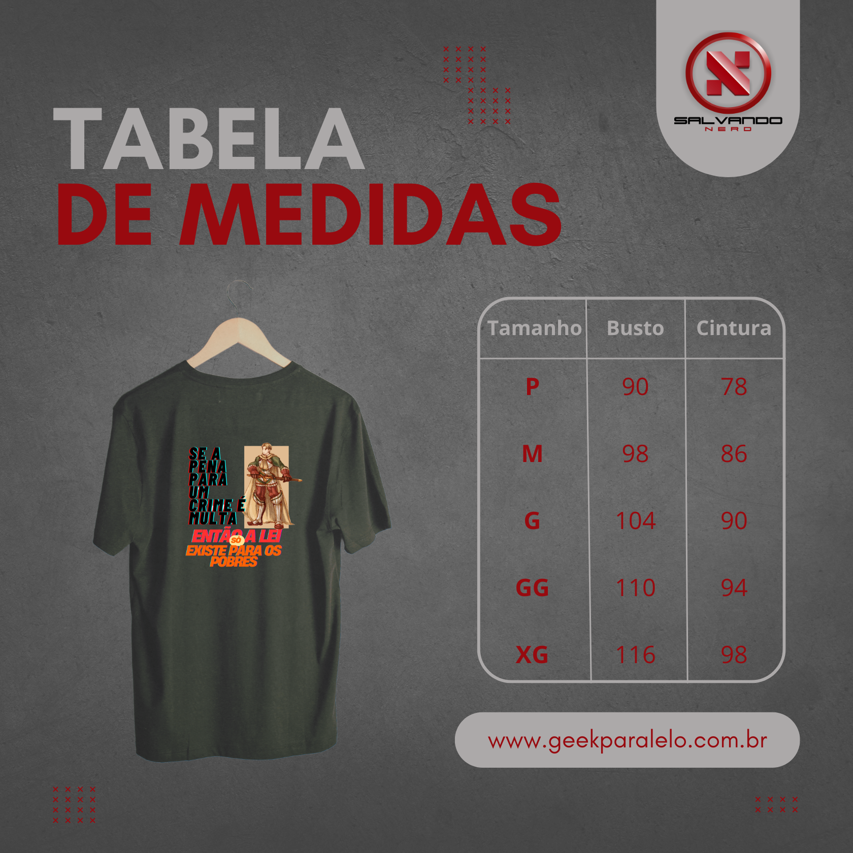 Atenção: As medidas podem variar um pouco, até 3cm pra mais ou pra menos, mas nada que mude o quanto ela vai ficar legal em você!