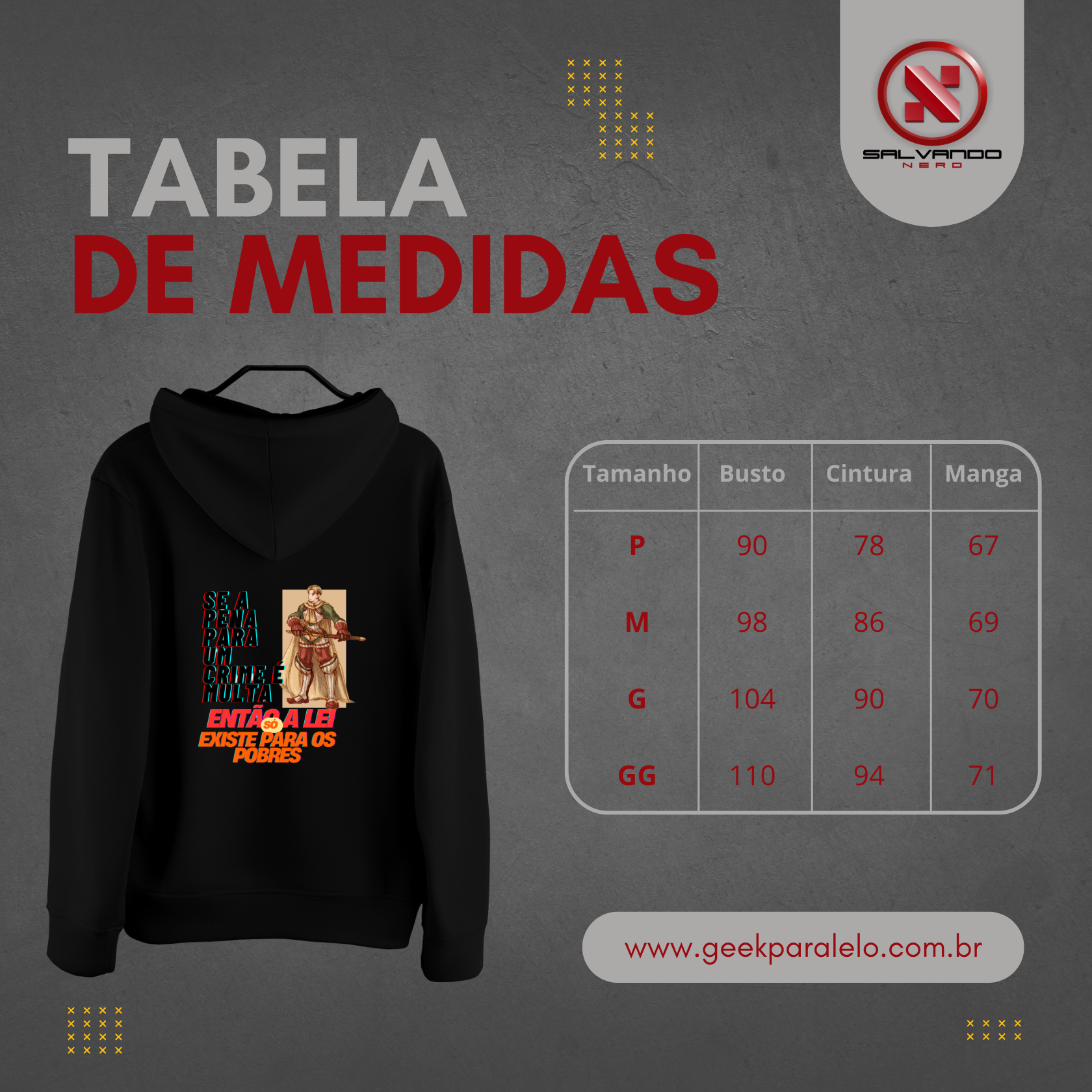 Atenção: As medidas podem variar um pouco, até 3cm pra mais ou pra menos, mas nada que mude o quanto ela vai ficar legal em você!