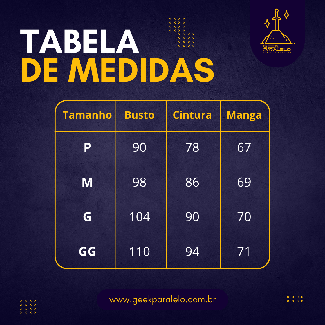 Atenção: As medidas podem variar um pouco, até 3cm pra mais ou pra menos, mas nada que mude o quanto ela vai ficar legal em você!