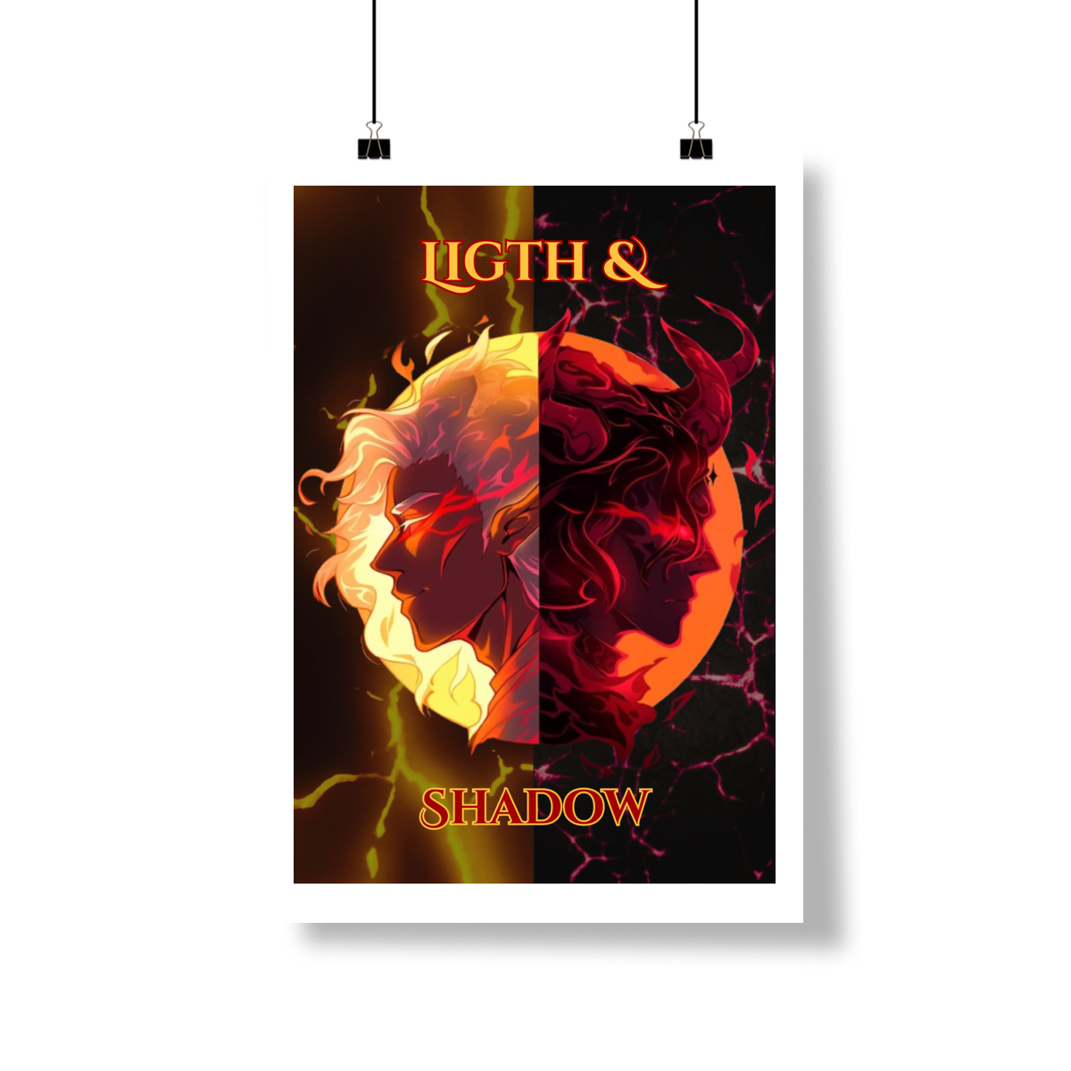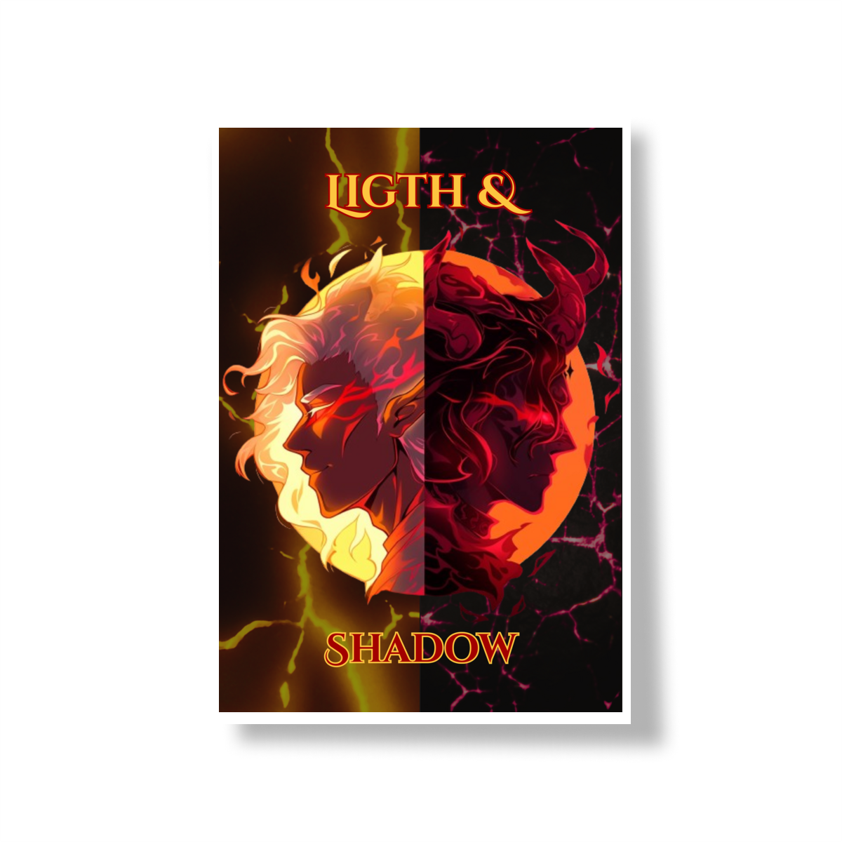Escolha seu lado nesta batalha épica entre a Luz e as Trevas. Inspirada nos mundos fantásticos de RPG e MMORPG, esta arte traz a essência da fantasia dark para o seu estilo.