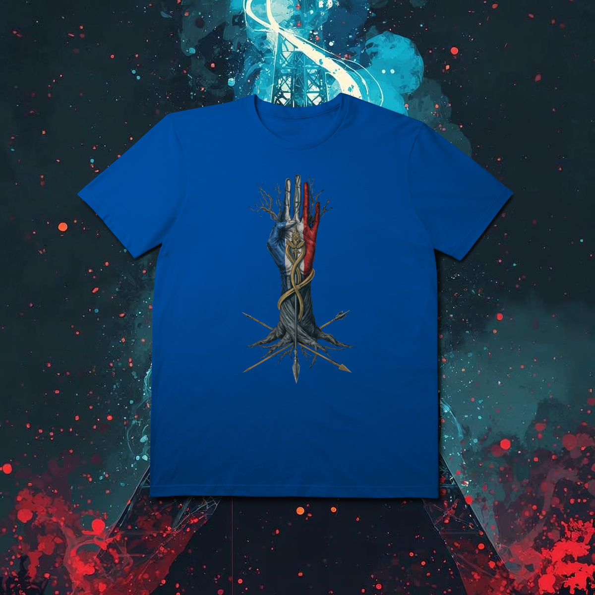 Inspirada nos símbolos mais marcantes da Revolução Francesa, esta arte transforma a Árvore da Liberdade em um totem místico, onde a Mão da Justiça, a bandeira tricolor e a Cocarde brilham como emblemas de força e mudança. Minimalista, dark e cheia de significado, é a peça ideal para quem carrega liberdade, coragem e história no peito.