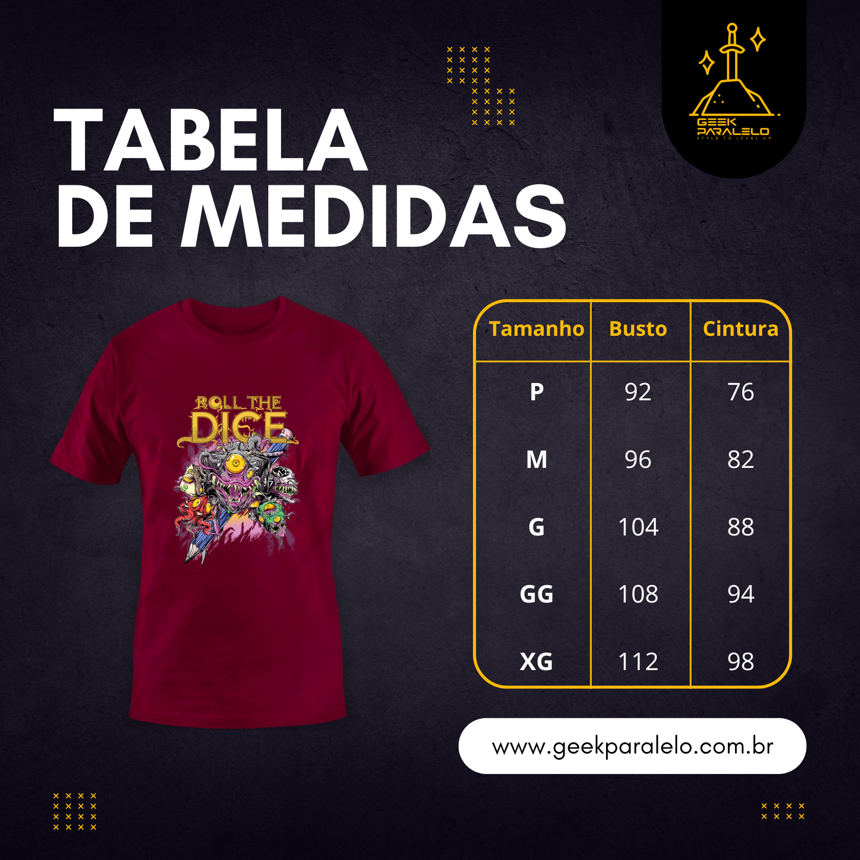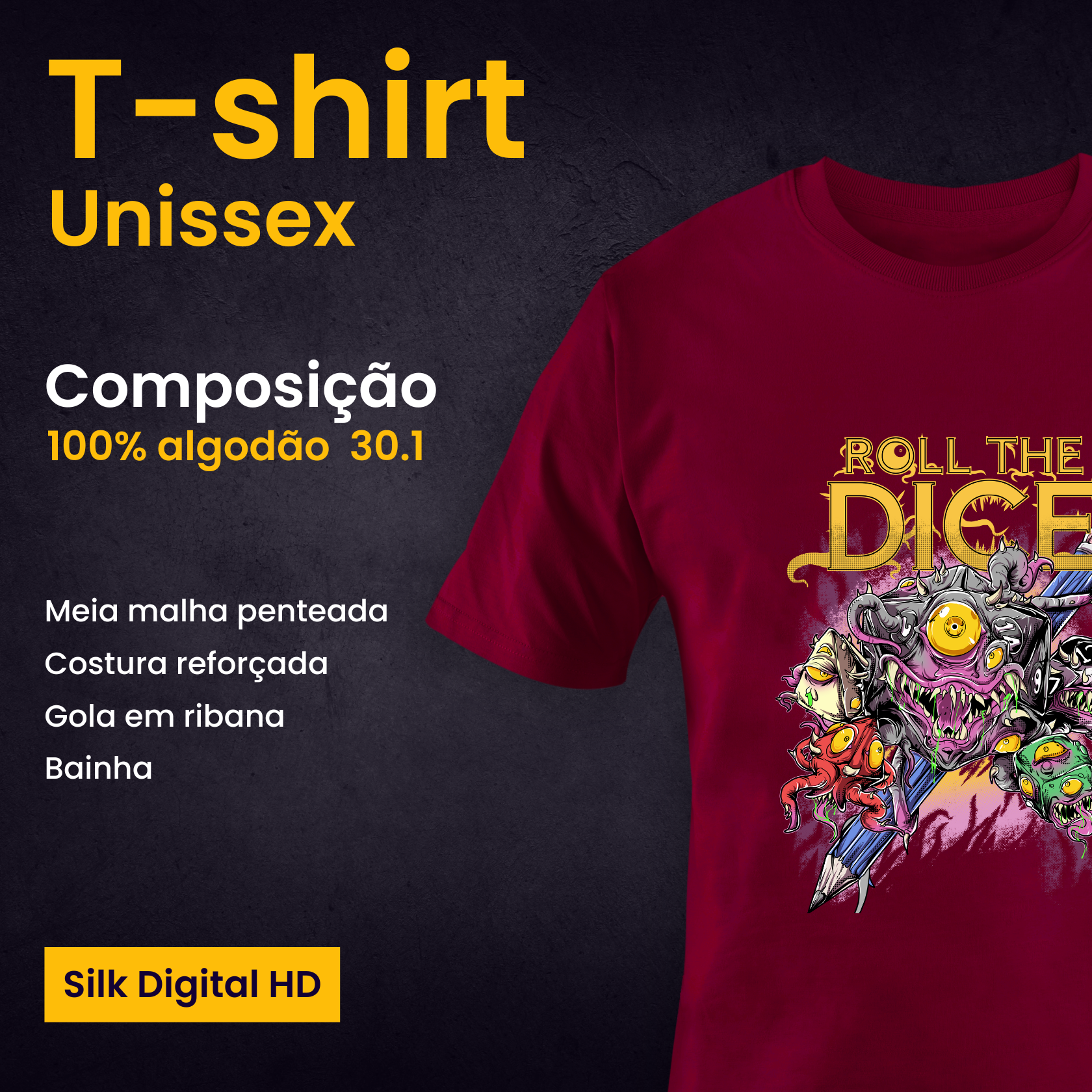 Nem tudo é o que parece em uma masmorra, exceto esta estampa que é simplesmente incrível, exclusiva e única. Mas lembre sempre: nem todo dado está do seu lado.