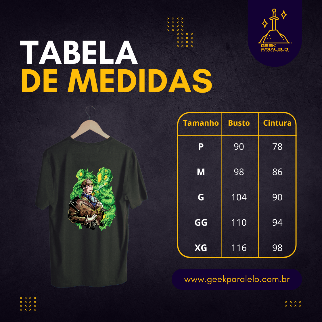 Atenção: As medidas podem variar um pouco, até 3cm pra mais ou pra menos, mas nada que mude o quanto ela vai ficar legal em você!